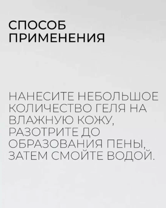| Способ применения | Нанесите немного средства на мочалку или губку, вспеньте и аккуратно распределите по телу легкими массирующими движениями. Тщательно смойте водой |