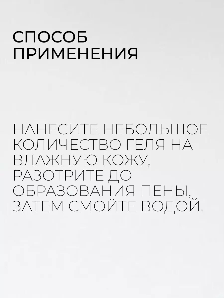 | Способ применения | Нанесите немного средства на мочалку или губку, вспеньте и аккуратно распределите по телу легкими массирующими движениями. Тщательно смойте водой |