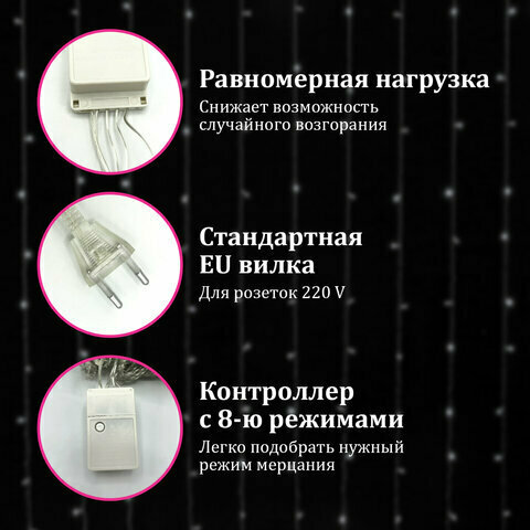 Электрогирлянда-занавес комнатная "Штора" 3х3 м, 196 LED, холодный белый свет, 220 V, золотая сказка, 591353 информация: