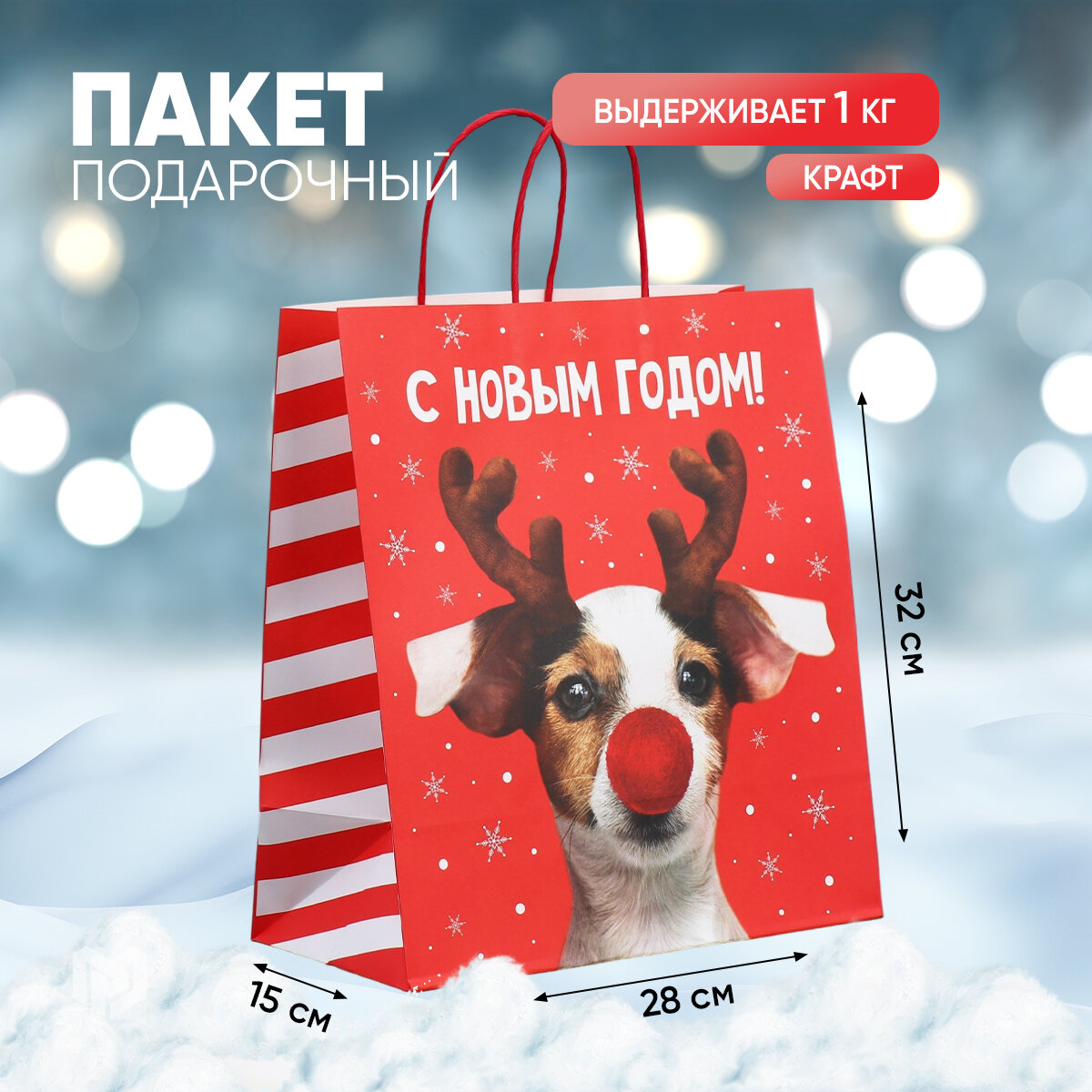 Пакет подарочный крафтовый, «Олень ты», 28 х 32 х 15 см, красный, для упаковки подарка на Новый год 152 ₽