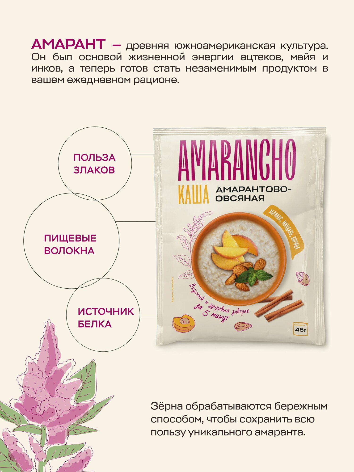 Каша амарантово-овсяная с абрикосом, миндалем, кардамоном и корицей, "Amarancho" быстрого приготовления 10 пакетиков по 45 г информация: