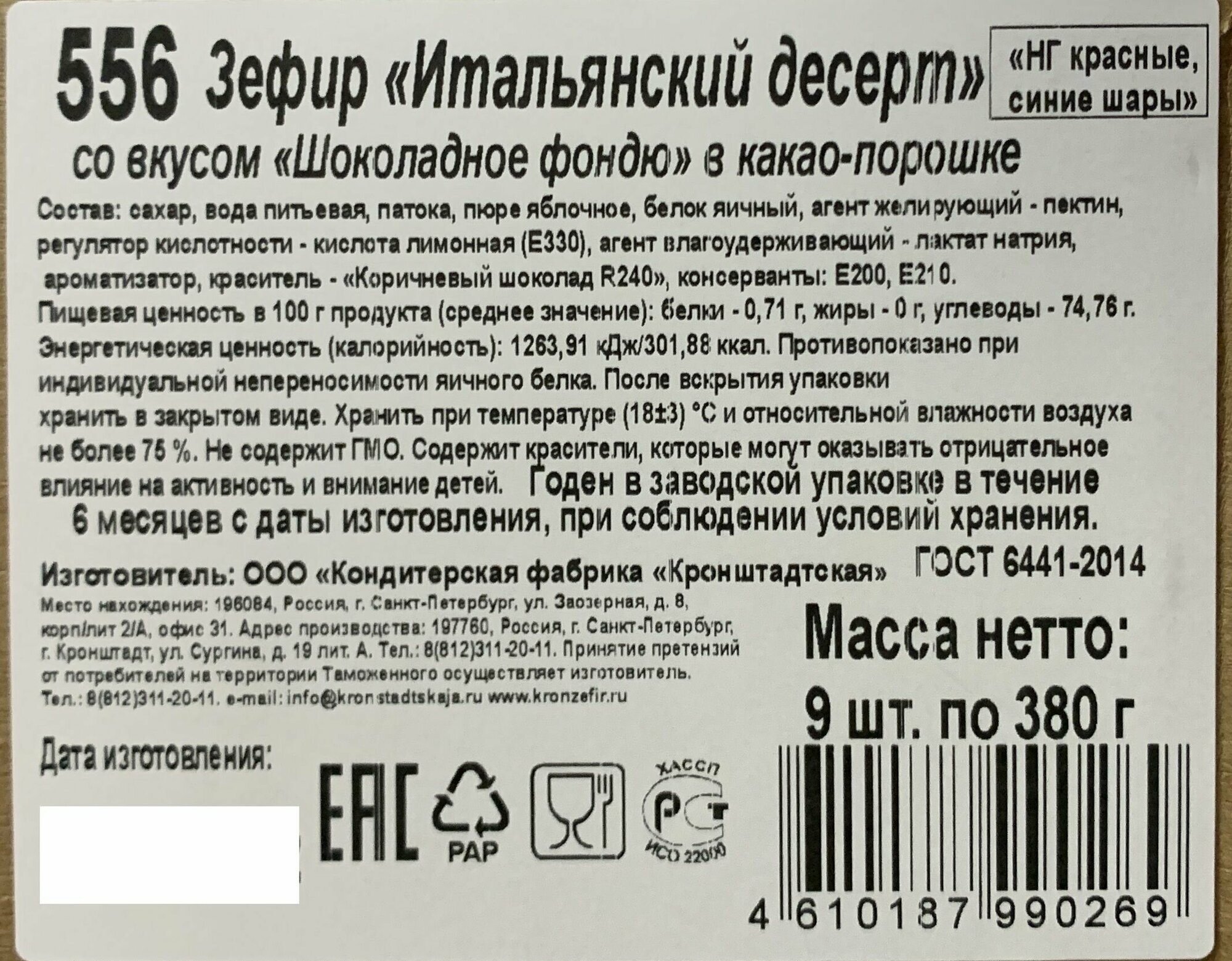 Новогодняя упаковка! Зефир "Шоколадное фондю" в какао-порошке "Итальянский десерт", КФ кронштадтская, 380г х 2шт информация: