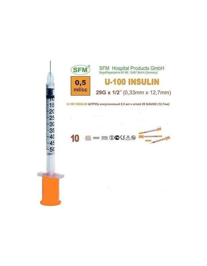 Шприц с иглой одноразовый инсулиновый U-100 29G SFM 0,5мл 0,33мм x 12,7мм 10шт