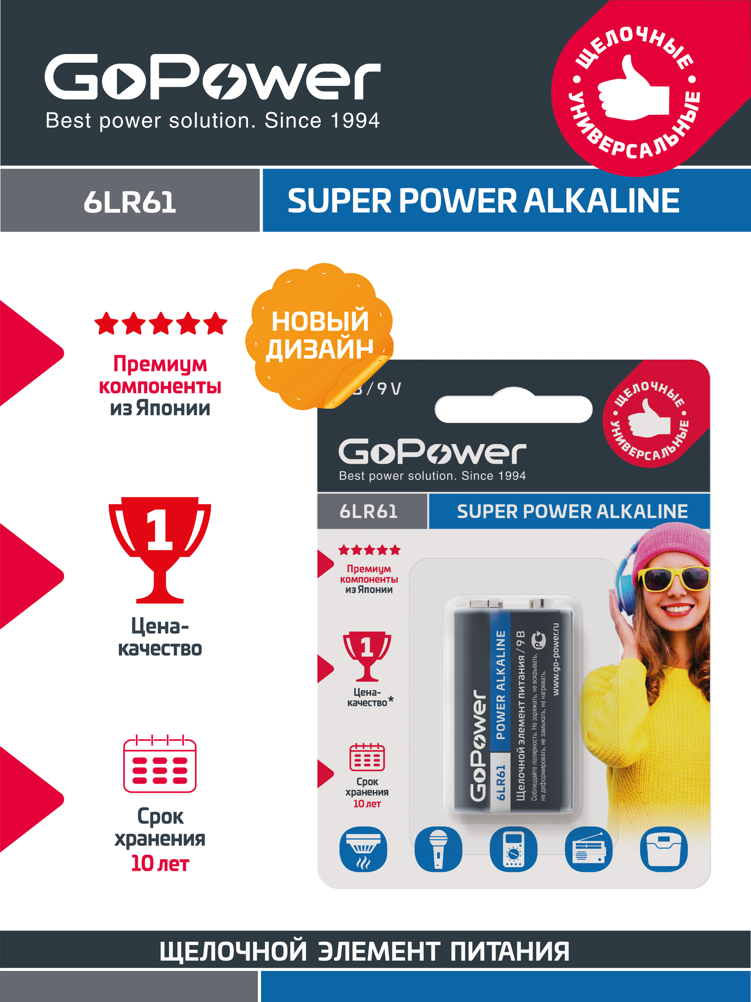 Элемент питания Крона 6LR61 9В, щелочной, GoPower 00-00017863 Super Power Alkaline информация: