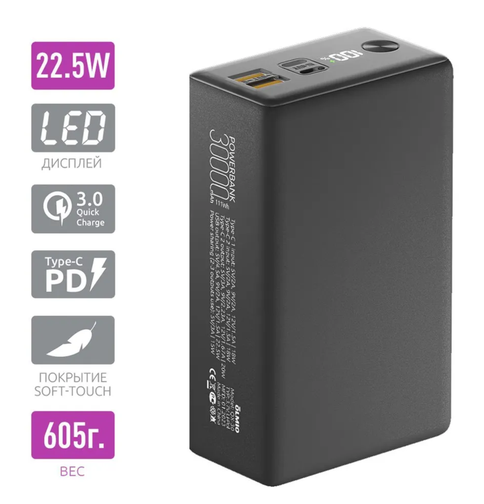 Внешний аккумулятор Olmio QX-30 30000mAh 22.5W PD Графитовый информация: