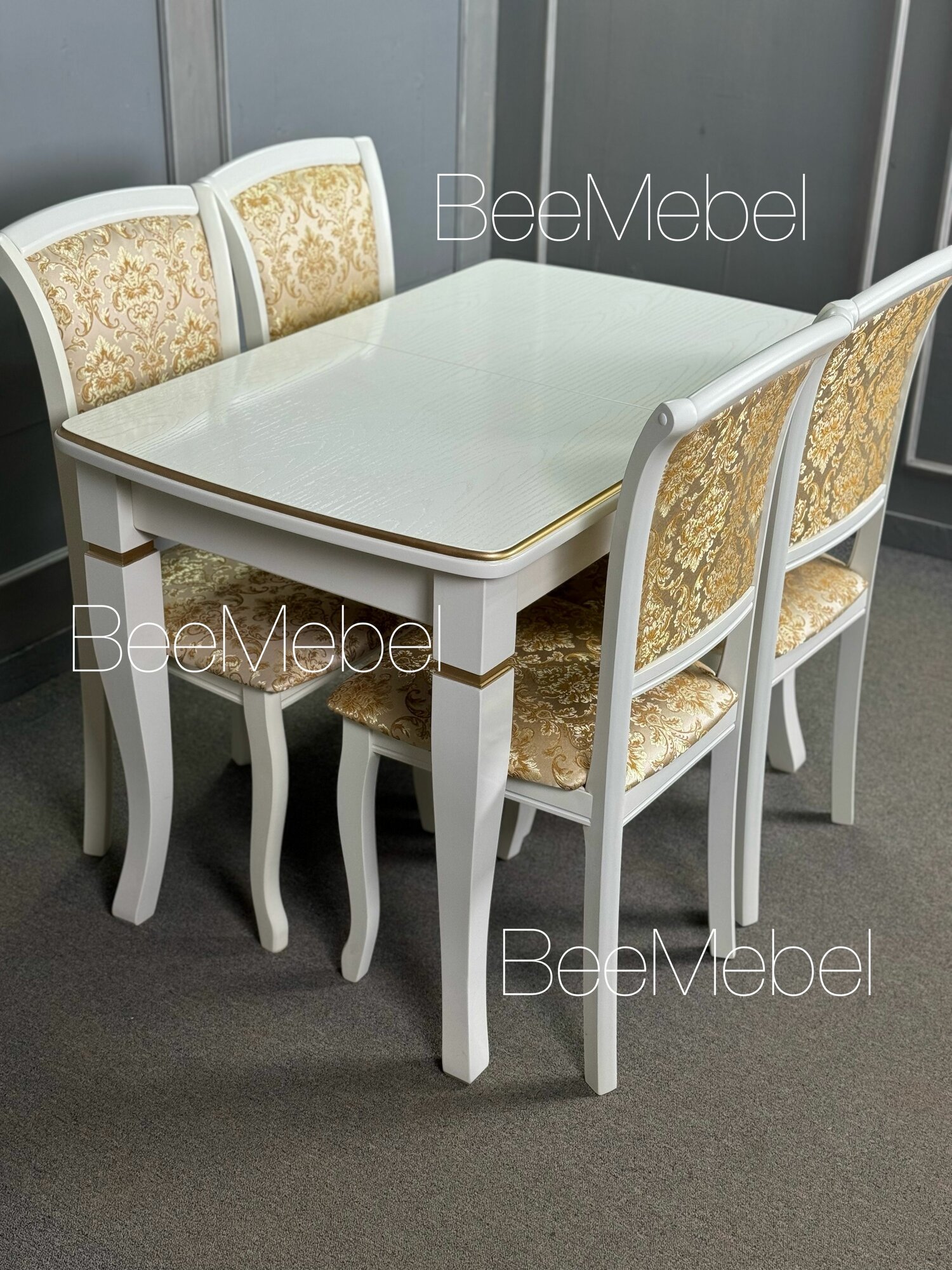 | Дополнительная информация | Обеденная группа, стол 110/70 раздвижной+40см и 4 стула из массива бука, обивка жаккард. цвет-слоновая кость с золотой патиной стол: столещница мдф покрытая шпоном , ножки из массива бука |