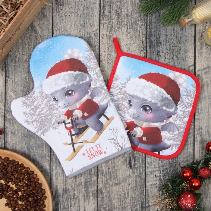10 цен на Новый год. Набор кухонный "Новогодние забавы": прихватка 19х19 см, варежка-прихватка 20х28 см, 100% х