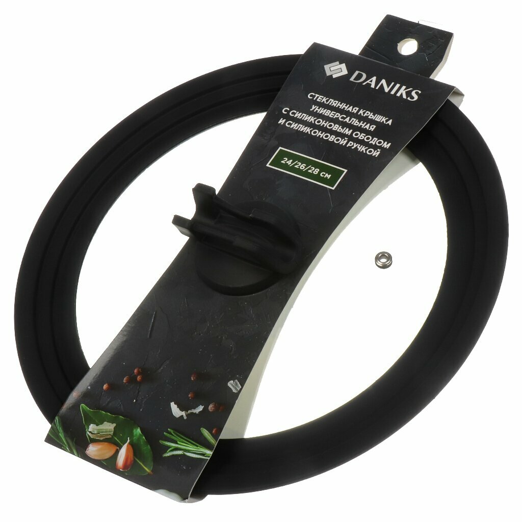 Крышка для посуды стекло, 28 см, Daniks, кнопка бакелит, силикон, черная, 24,26,28 см, с силиконовыми ручками, ободом, GLM-242628 информация: