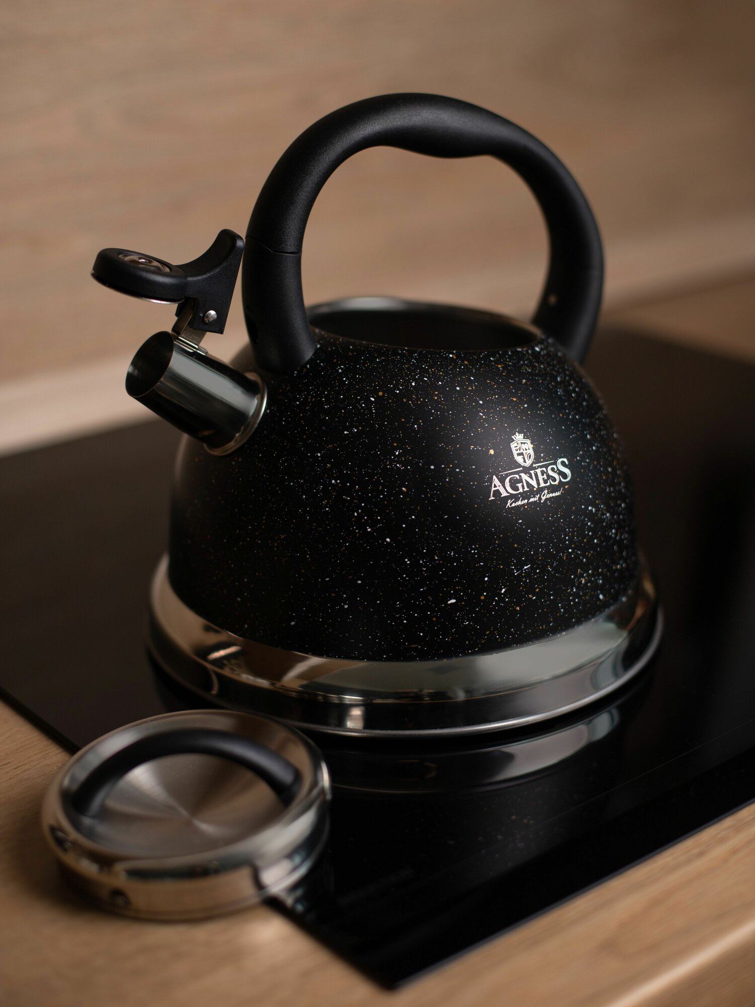 10 цен на Чайник Agness со свистком, серия "Black Marble" 3 л и складывающейся ручкой, индукционное капсульное дно