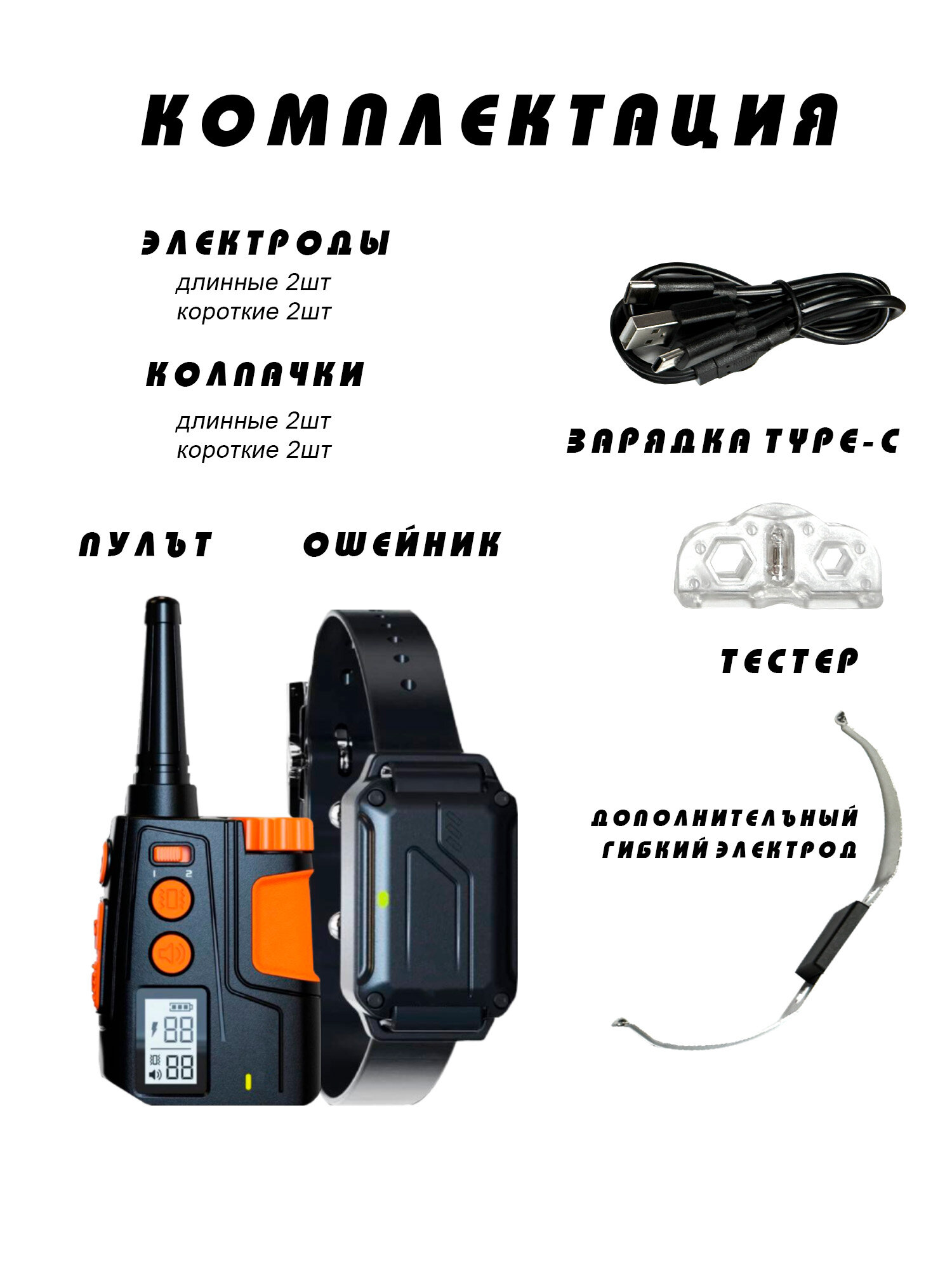 | Комплектация | электронный ошейник; пульт дистанционного управления; инструкция; кабель зарядного устройства; наконечники; силиконовые колпачки |