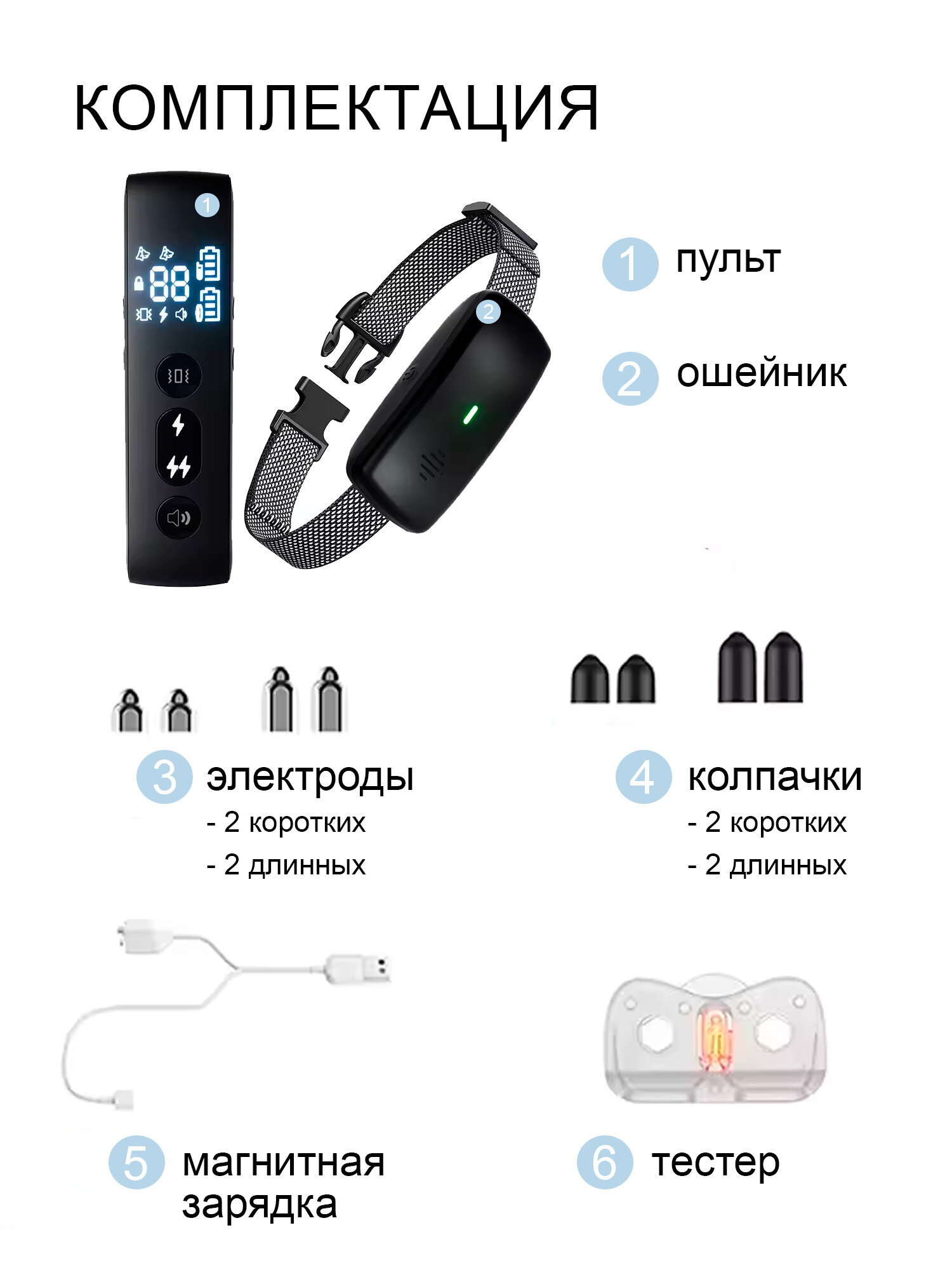 | Комплектация | электронный ошейник; пульт дистанционного управления; инструкция; кабель зарядного устройства; наконечники; силиконовые колпачки |