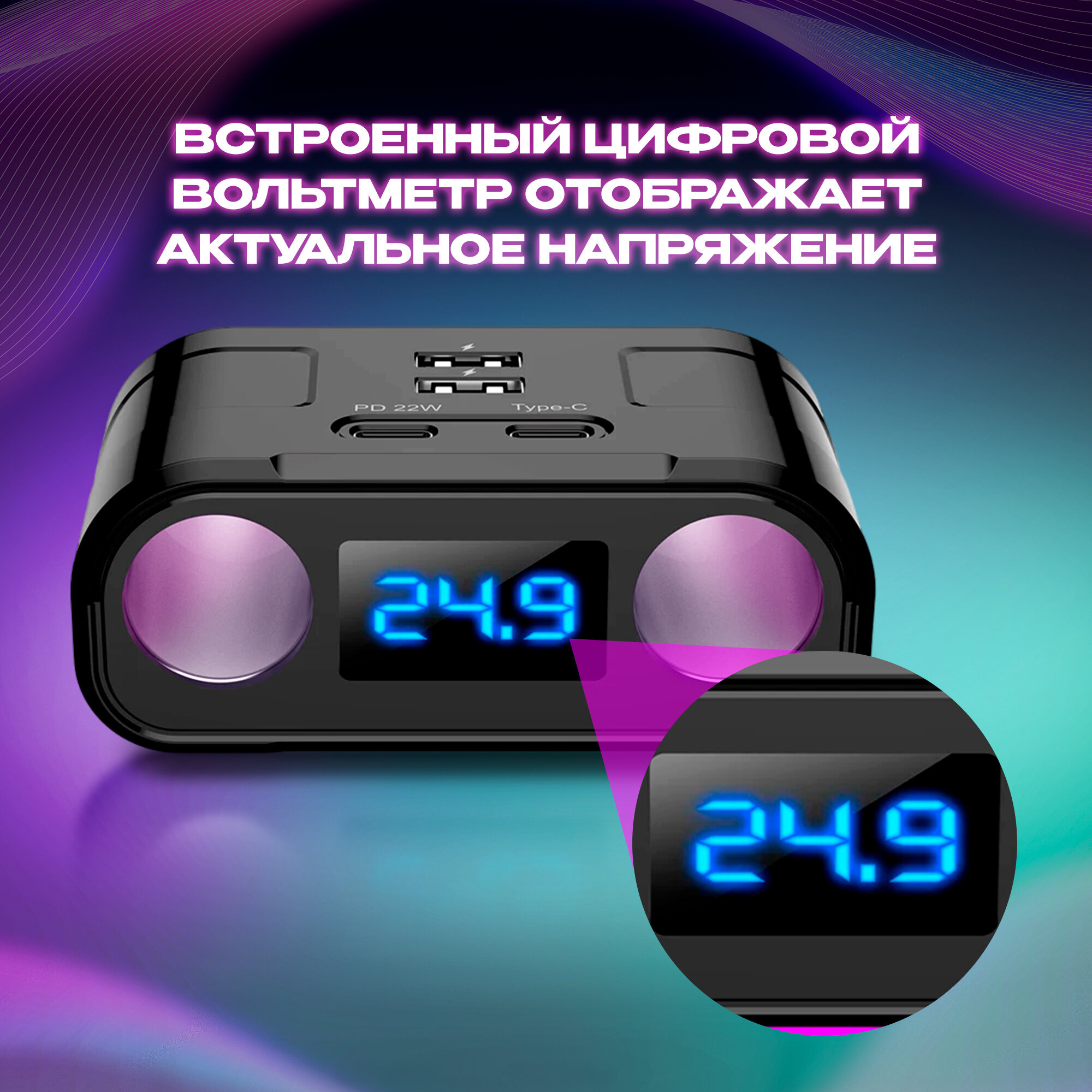 10 цен на Разветвитель прикуривателя, 120Вт, 2хUSB, 2хType-C, вольтметр, черный// usb разветвитель, прикуриватель автомобильный