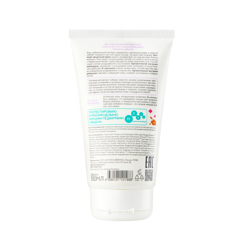 Крем защитный под подгузник "Мамина забота", 0+, 150 мл, Siberica Biberika информация: