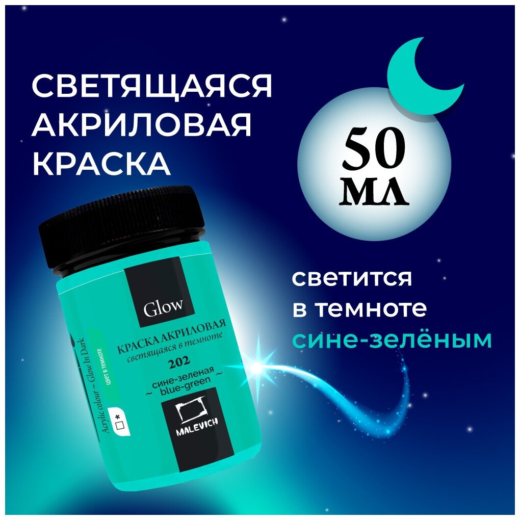 Краска акриловая Малевичъ Glow светящаяся в темноте, сине-зеленая, 50 мл информация: