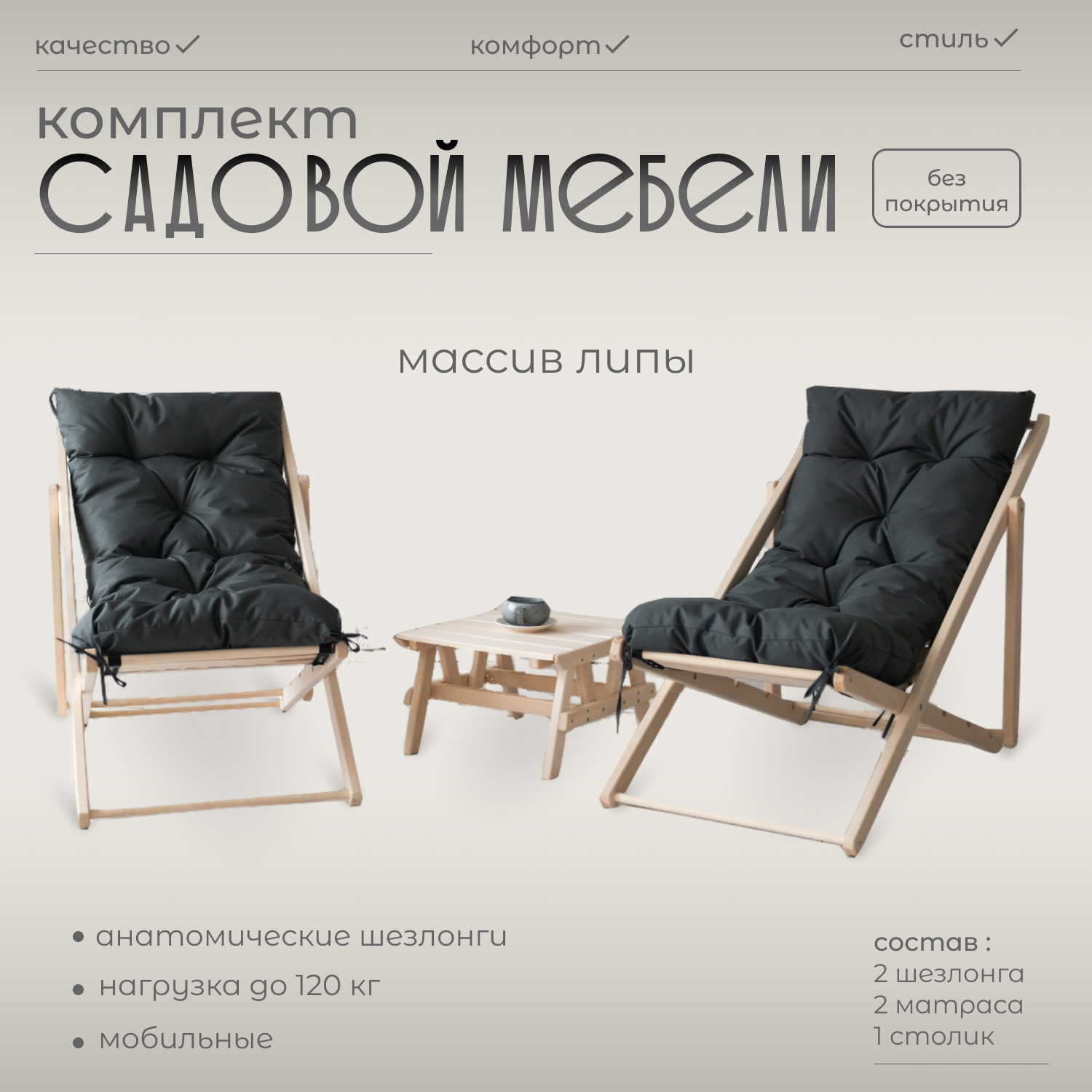 Отзывы на Комплект из двух кресел-шезлонгов без покрытия с серыми матрасами и чайным столиком