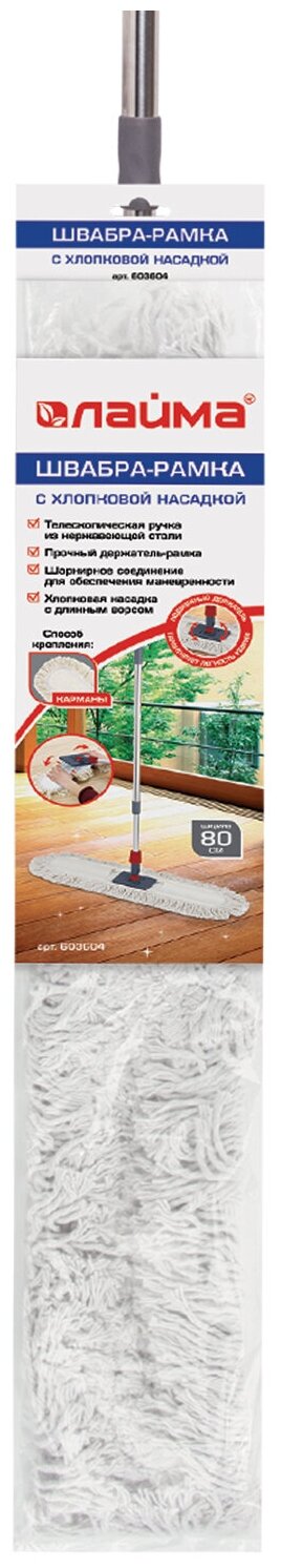 Швабра-рамка 80 см, телескопический черенок из нержавеющей стали 125 см, МОП хлопок, LAIMA, 603604 1 шт. информация: