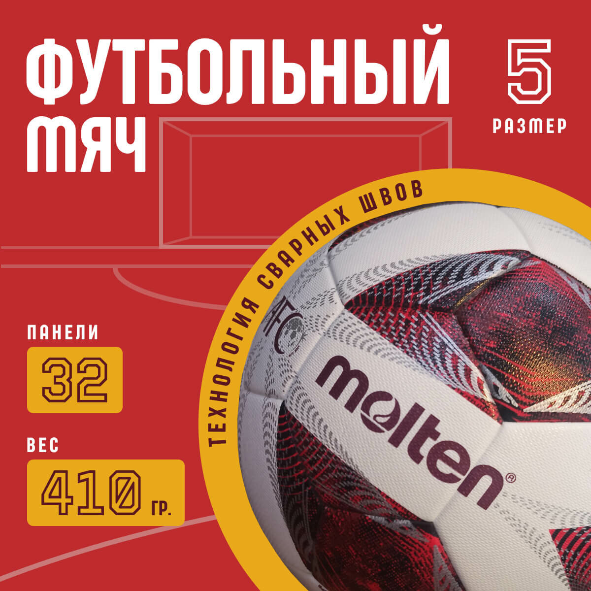 Мяч футбольный Molten F5A5000, размер 5, 32 панели, красный, белый информация: