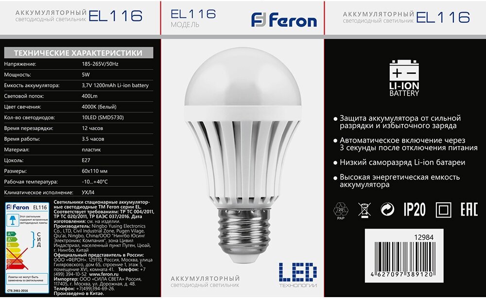 Светильник аккумуляторный, 5W Е27 AC/DC (литий-ионная батарея), белый, EL116 fr_12984 информация: