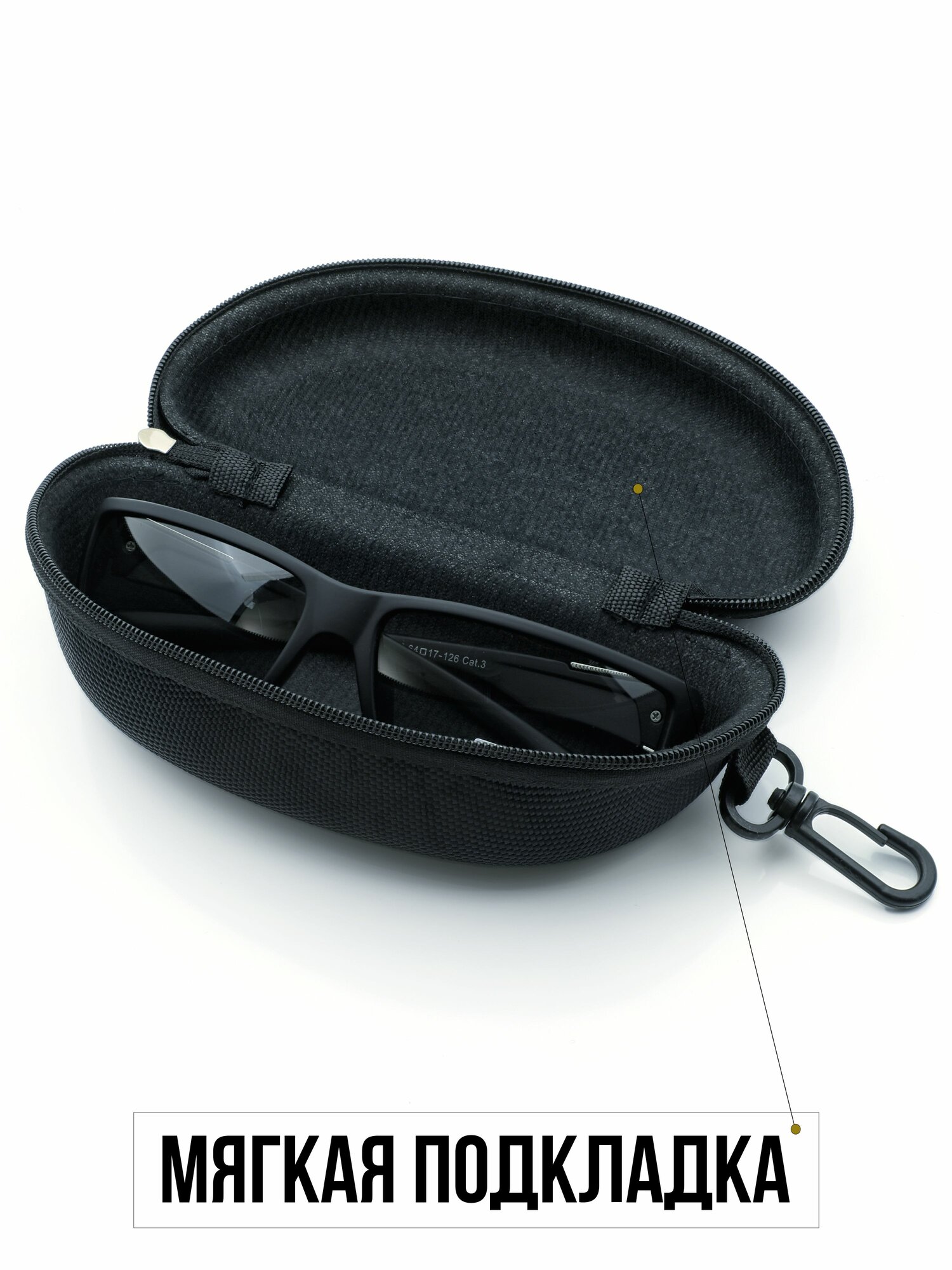 Футляр на карабине Широкий для очков на молнии 2 штуки. с салфетками очечник чёрный жёсткий информация: