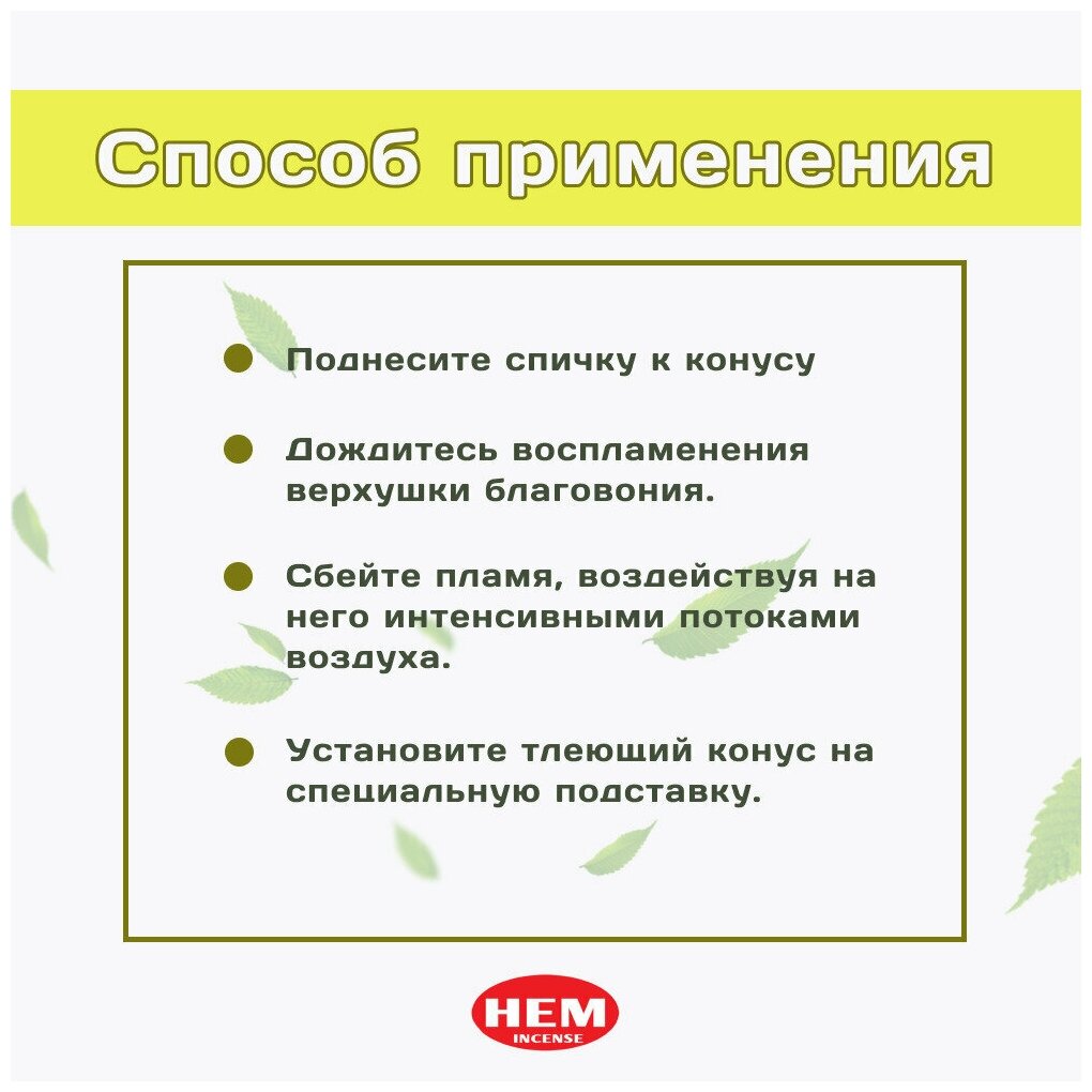 | Дополнительная информация | Способ применения 1. Поднесите спичку к конусу. 2. Дождитесь воспламенения верхушки благовония. 3. Сбейте пламя, воздействуя на него интенсивными потоками воздуха. 4. Установите тлеющий конус на специальную подставку. КОНУС ДОЛЖЕН ТЛЕТЬ, А НЕ ГОРЕТЬ! ПЛАМЯ ОБЯЗАТЕЛЬНО НЕОБХОДИМО ПОТУШИТЬ! |