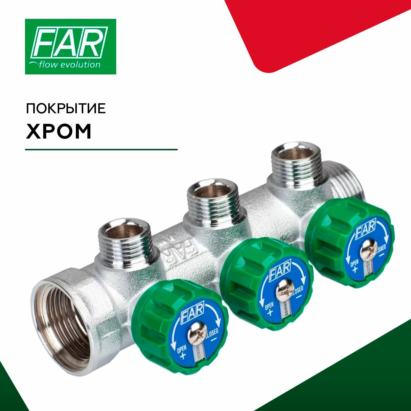 Коллектор FAR 3/4"х1/2" 3 выхода под конус хромированный с вентилями