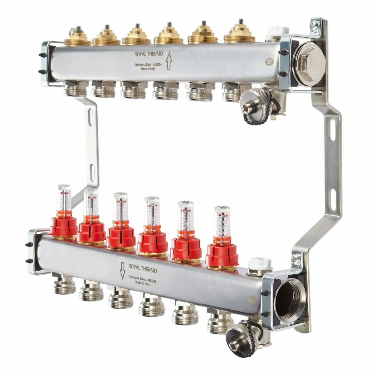 Royal Thermo Коллектор нерж. в сборе с расходомерами 1" ВР-3/4" НР, 6 выходов