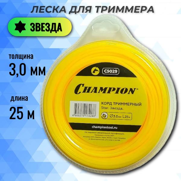Корд триммерный CHAMPION 3 мм, звезда. Леска для триммера Star. Струна для косы и газонокосилки в мотке. C5029 информация: