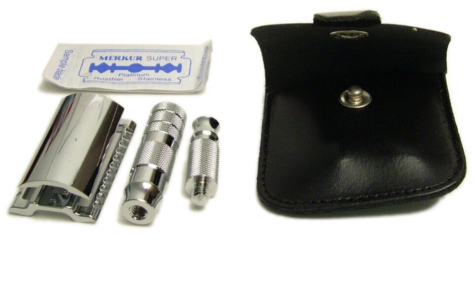 Станок Т- образный для бритья MERKUR хромированный, разборный, в чехле из натуральной воловьей кожи,