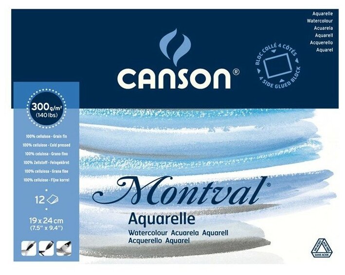 10 цен на Бумага для акварели Canson Блок для акварели Montval CANSON, 300г/м2, 19х24см, Фин, склейка 12 листов