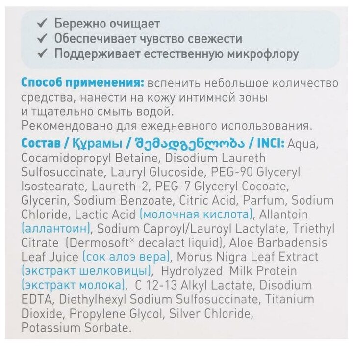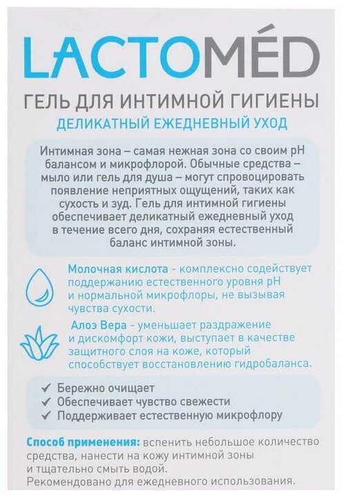 | Состав | Lactomed Гель для интимной гигиены «Деликатный ежедневный уход» pH 4,8-5,3, 200 мл |