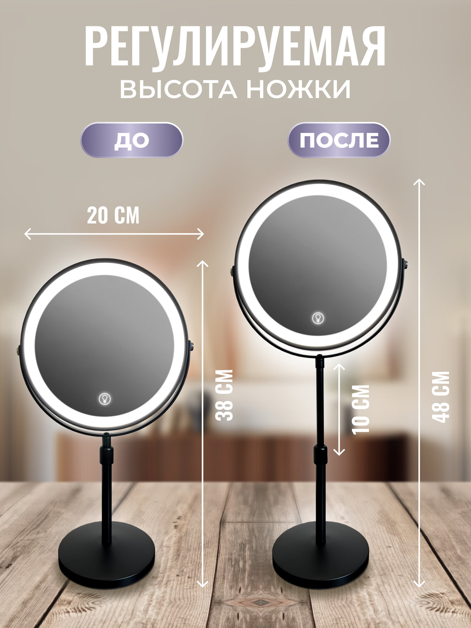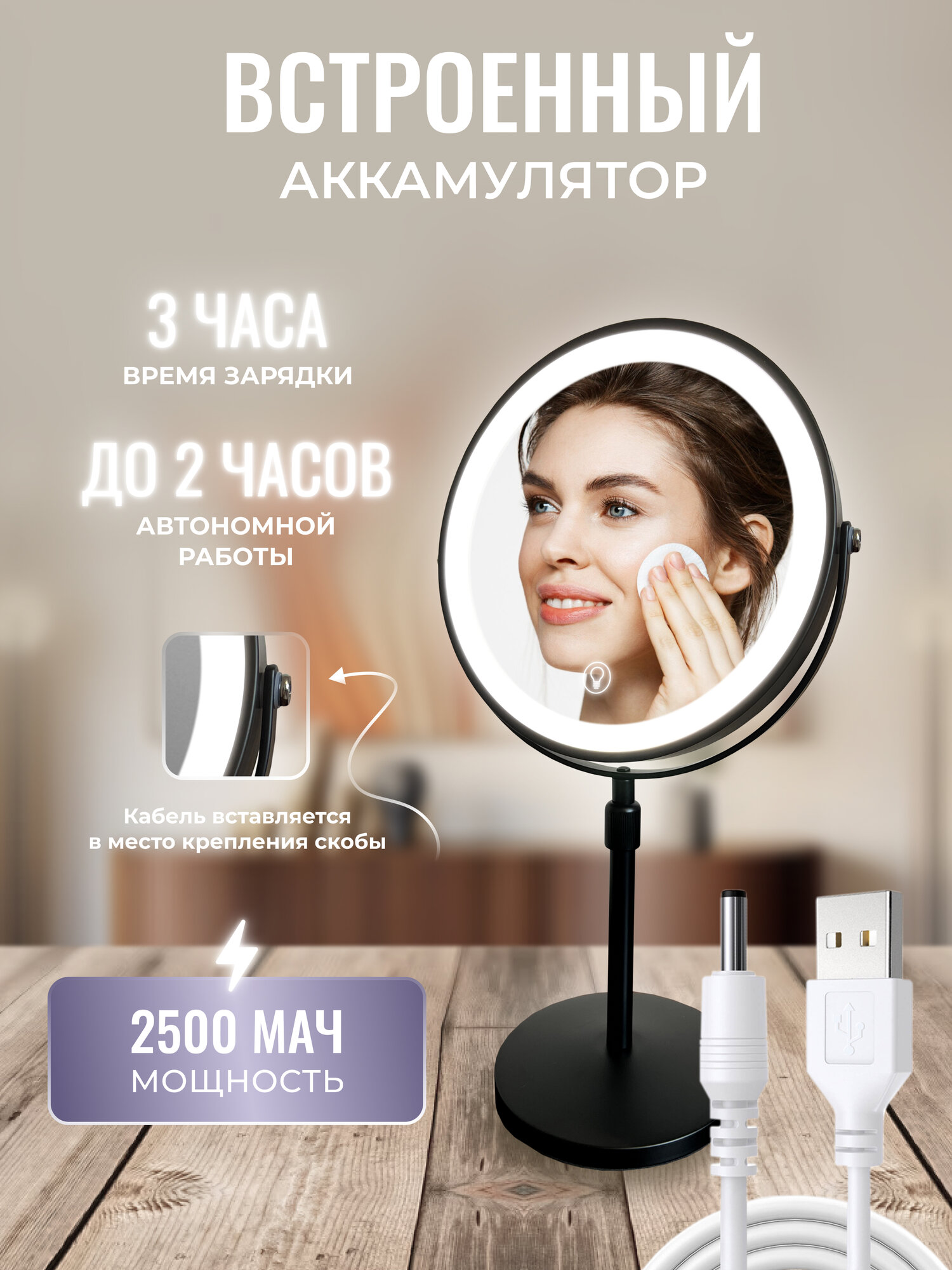 Зеркало настольное увеличительное с подсветкой, двустороннее, 10х и 1х, черное информация: