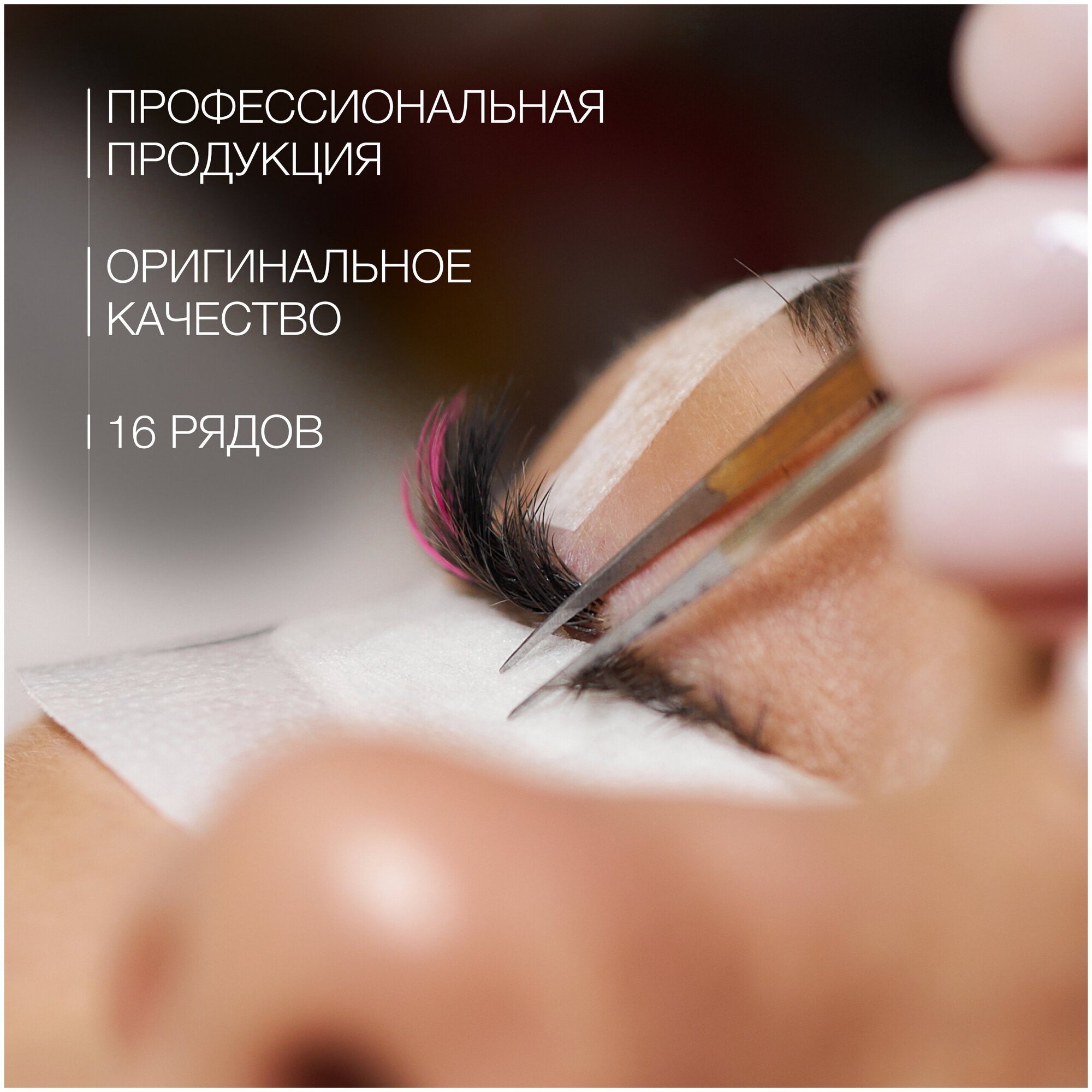 | Дополнительная информация | Поместите линию ресниц на планшет и подготовьте клей для наращивания ресниц. С помощью пинцета снимите ресницу или пучок с ленты, обмакните основание в клей и поставьте на натуральную ресницу. |