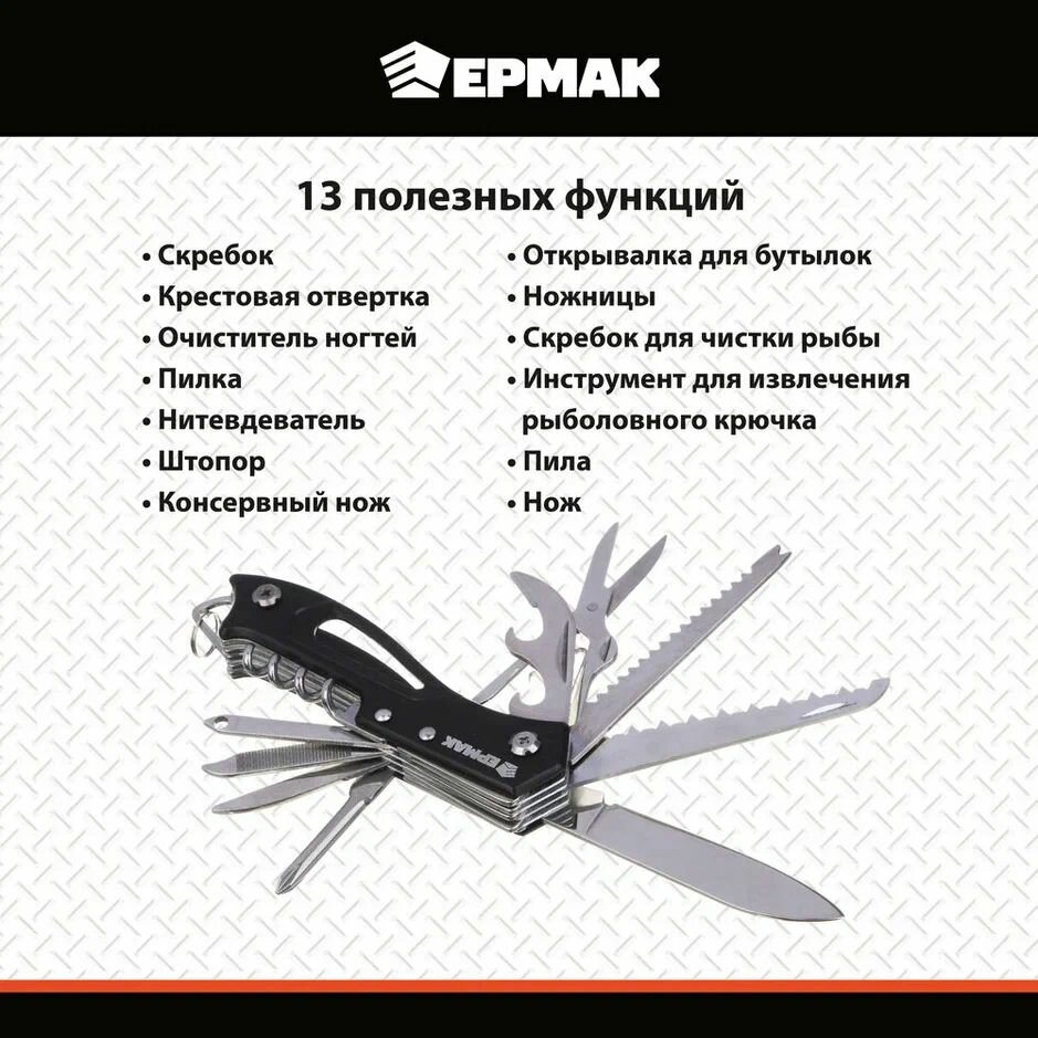 Многофункциональный инструмент ермак, 11 функций, нержавеющая сталь / Мультитул универсальный 118-169 / Нож складной, пассатижи, отвертка