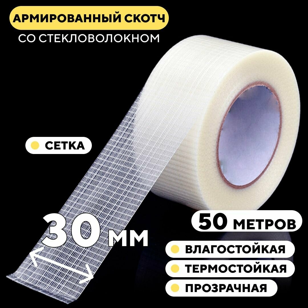 10 цен на Скотч армированный стекловолокном, прозрачный / 30 мм / Сетка / 50 м