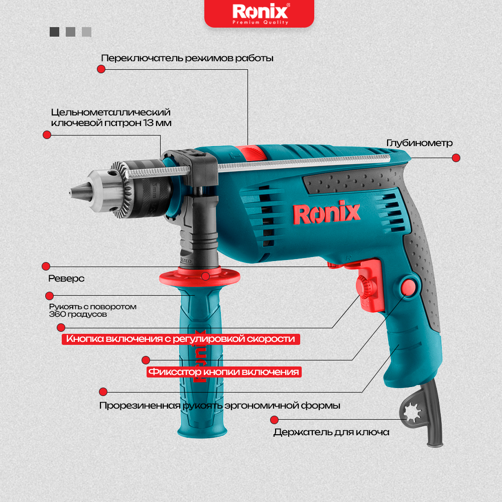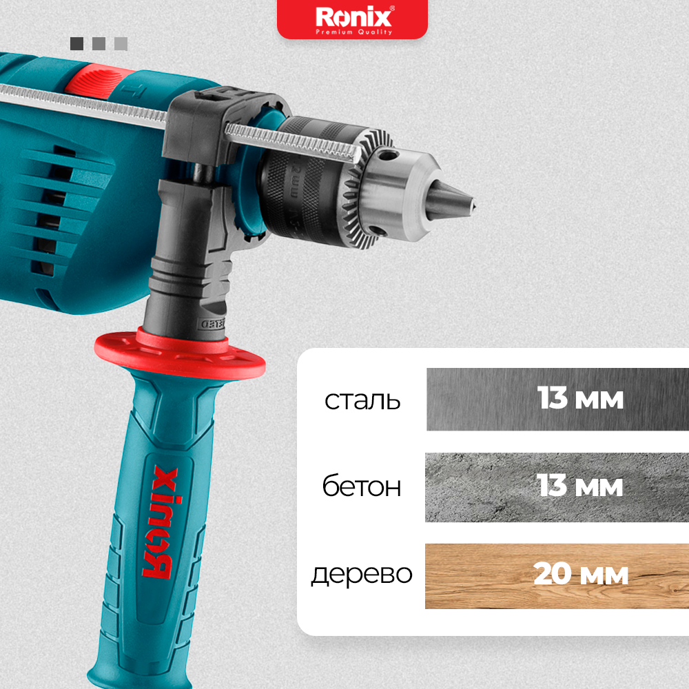 Ударная сетевая дрель Ronix мощностью 750Вт ключевой патрон, функция реверса, регулировка глубины сверления, дополнительная рукоять 7 499 ₽