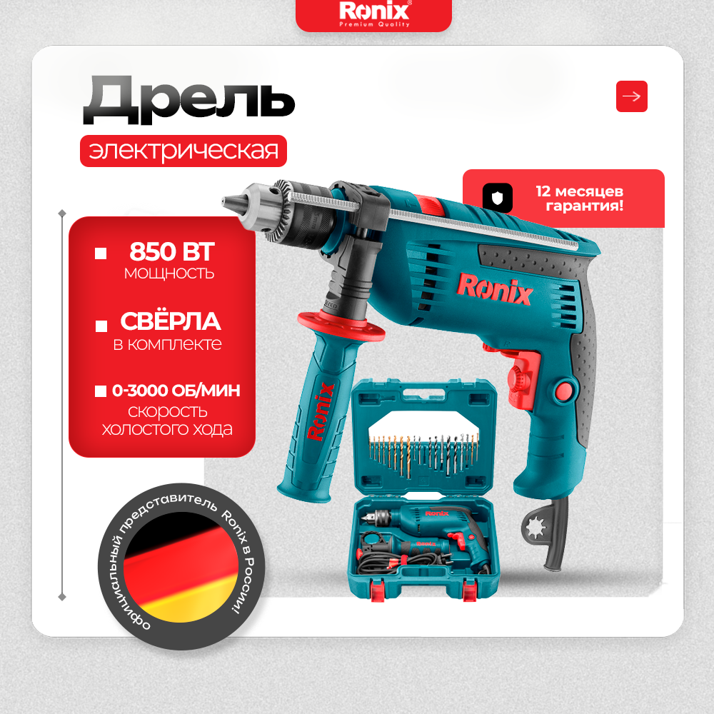 Отзывы на Электрическая дрель с комплектом сверл 20 шт Ronix 850Вт, скорость без нагрузки 0-3000об/мин+ кейс со смотровым окном