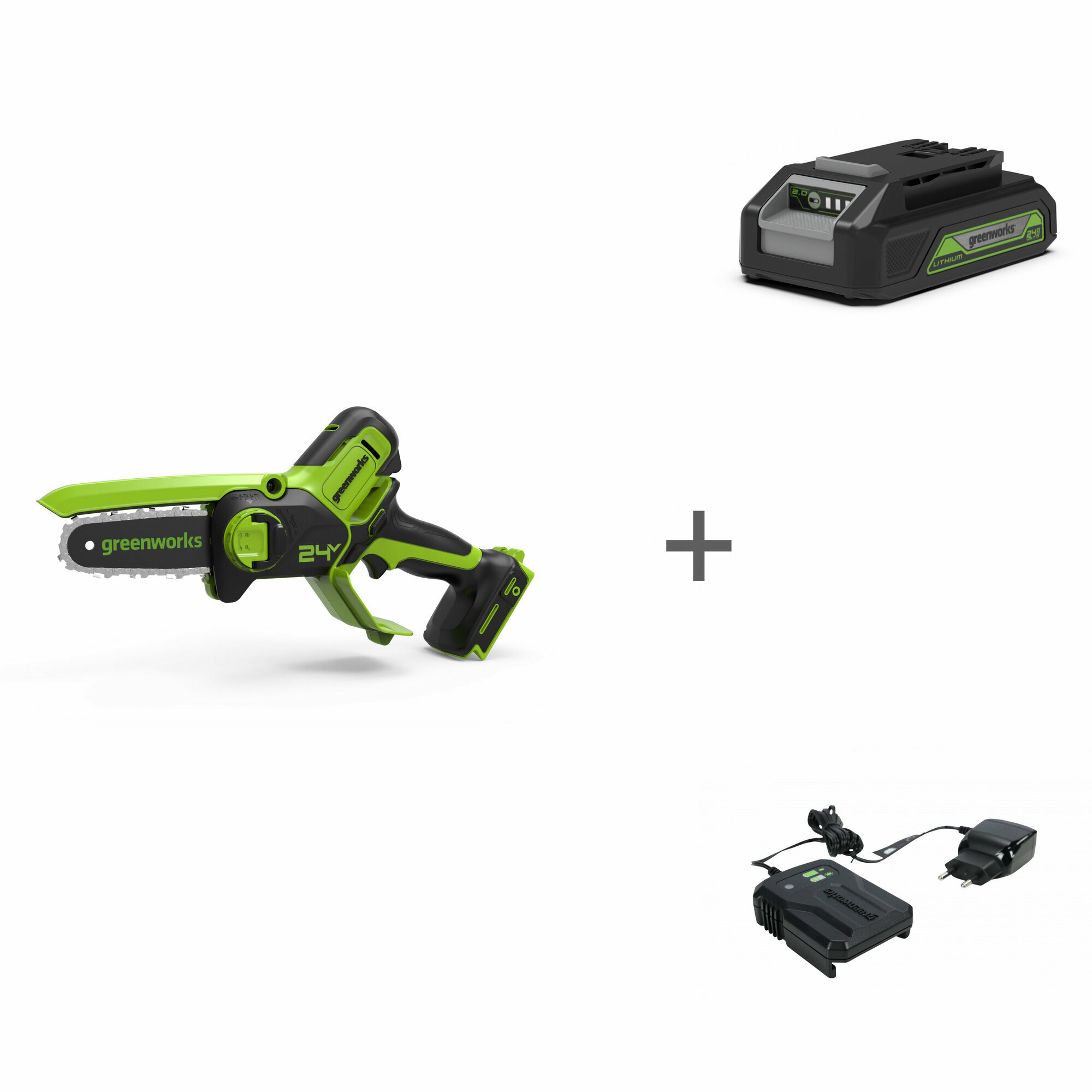 Цепная мини пила аккумуляторная Greenworks G24MCS10, 24V, 10см, c 1хАКБ 2Ач и ЗУ