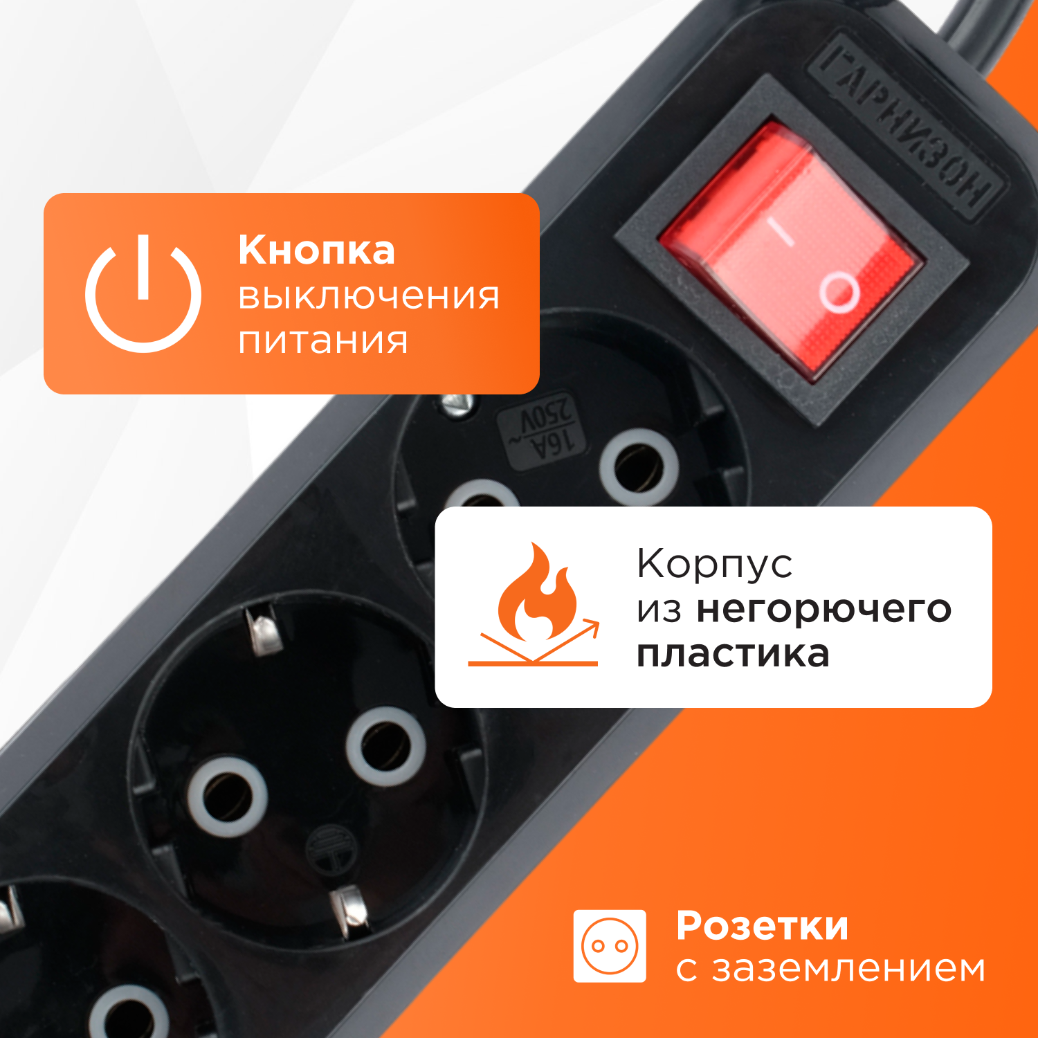 Сетевой фильтр Гарнизона 16A, 5 метров, 3 розетки, защита от перенапряжений и заземления 550 ₽