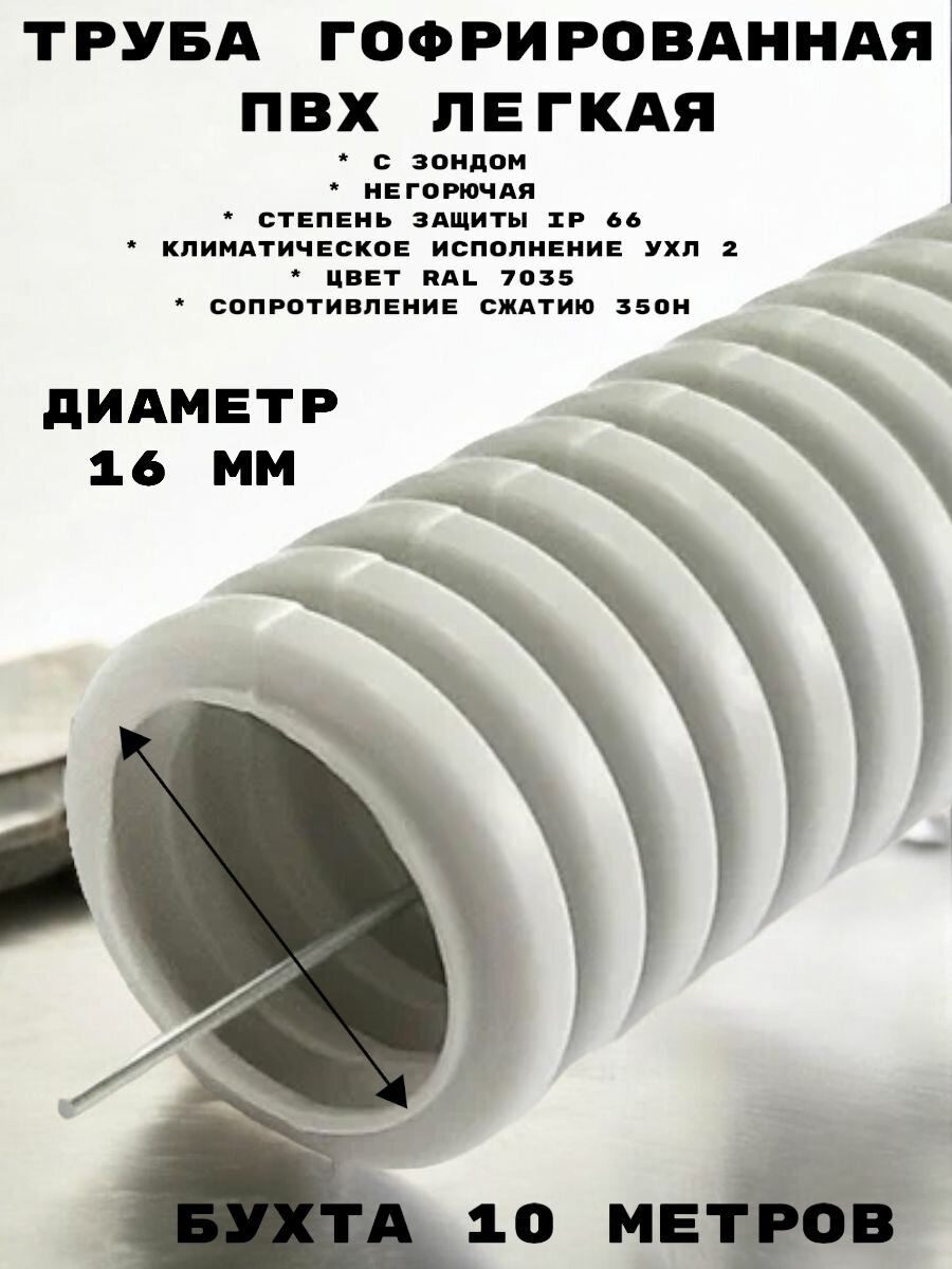 Труба гофрированная ПВХ гибкая 16мм легкая с протяжкой (10м) цвет серый PR.011631М10 Промрукав информация: