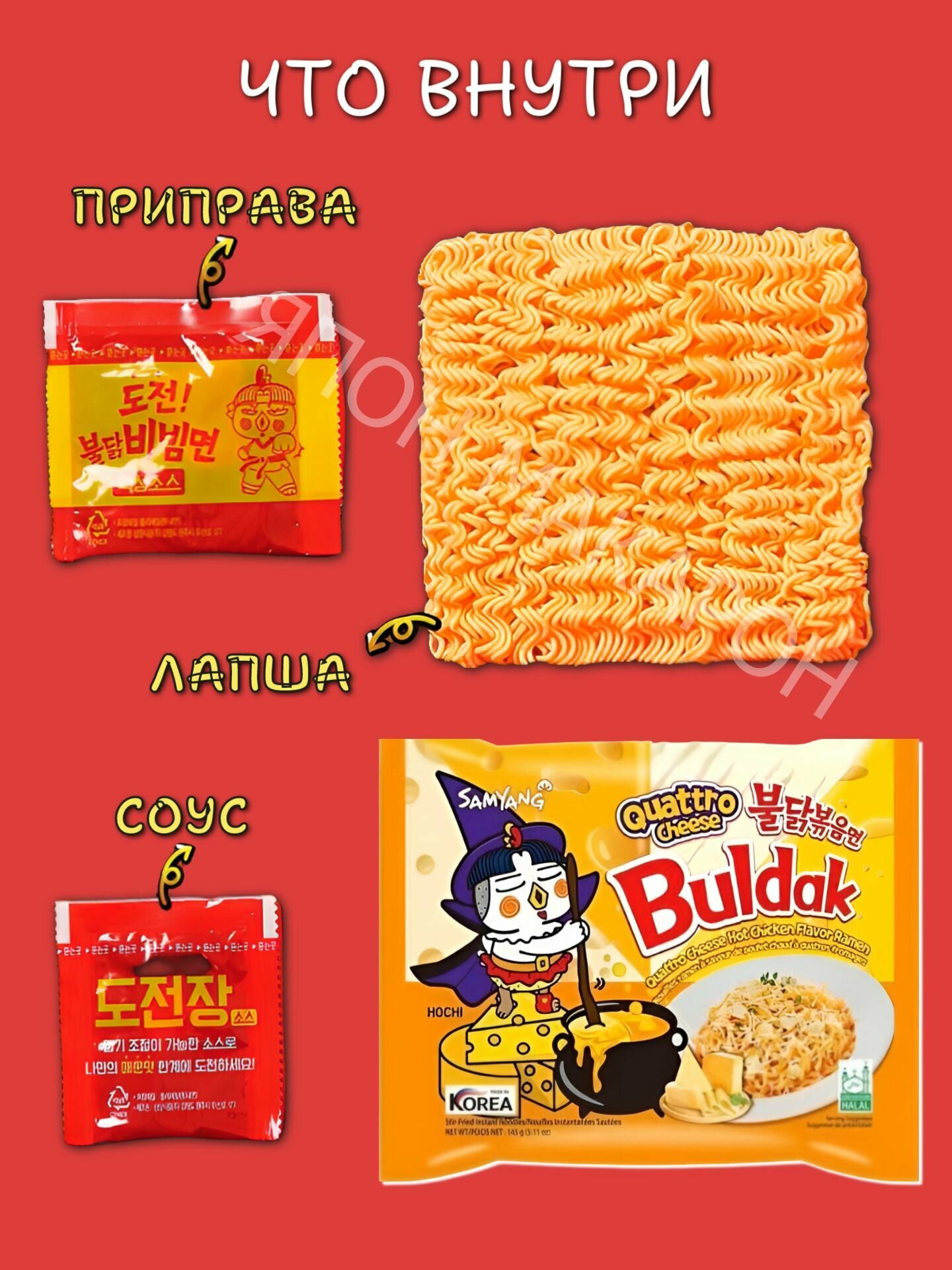 Корейская лапша быстрого приготовления SAMYANG Quattro Cheese 4 сыра. Острая лапша информация: