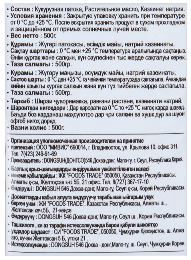 | Состав | кукурузная патока, растительное масло, казеинат натрия |