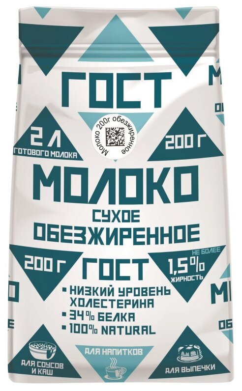 Сухое молоко обезжиренное ГОСТ 1,5%, 200г информация: