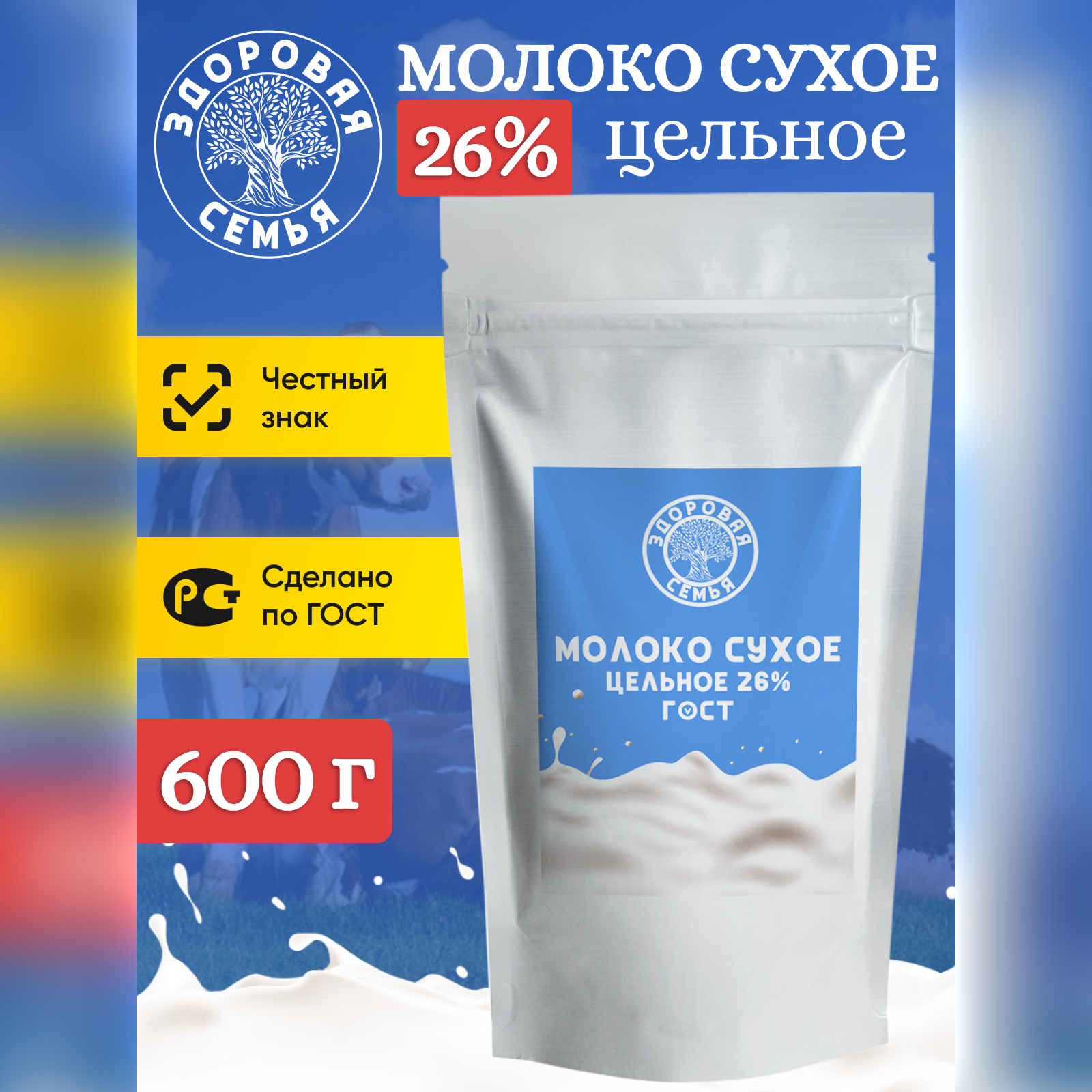 Молоко сухое Здоровая Семья цельное 26% ГОСТ, 600 г, натуральное, заменитель молока для чая, кофе и выпечки, без сахара информация: