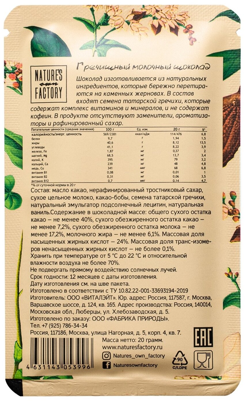 Шоколад Nature's own Factory гречишный молочный, 20 г, 6 шт. в уп.