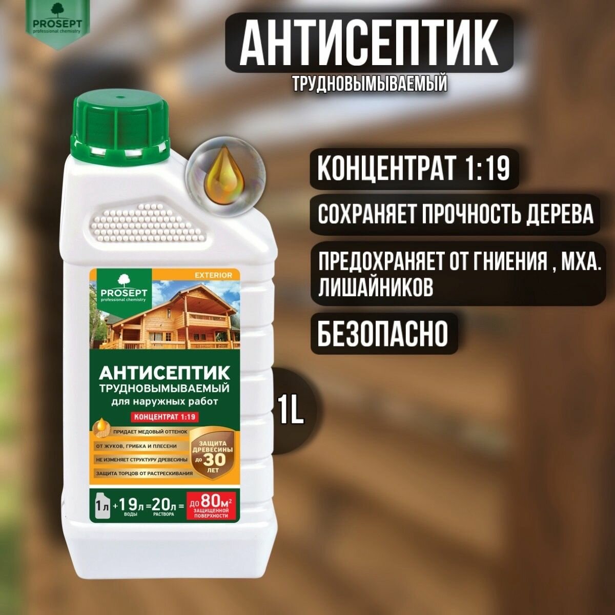 PROSEPT (Просепт) Антисептик трудновымываемый для наружных работ EXTERIOR, медовый концентрат 1:19, 1 л