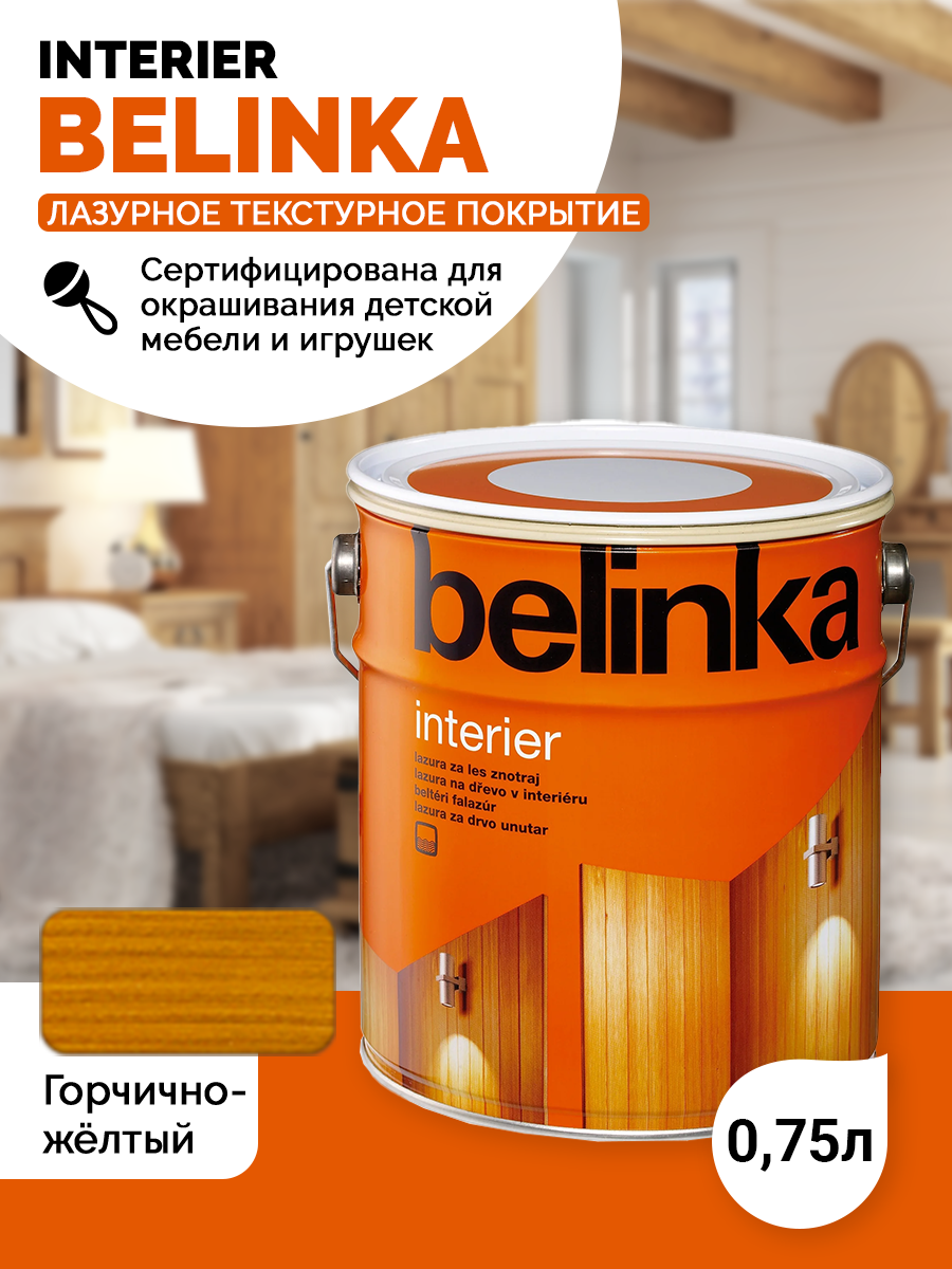 10 цен на Belinka Interier (0,75 л 64 - горчично-желтый) Белинка Интерьер лазурь на водной основе для защиты древесины внутри помещений