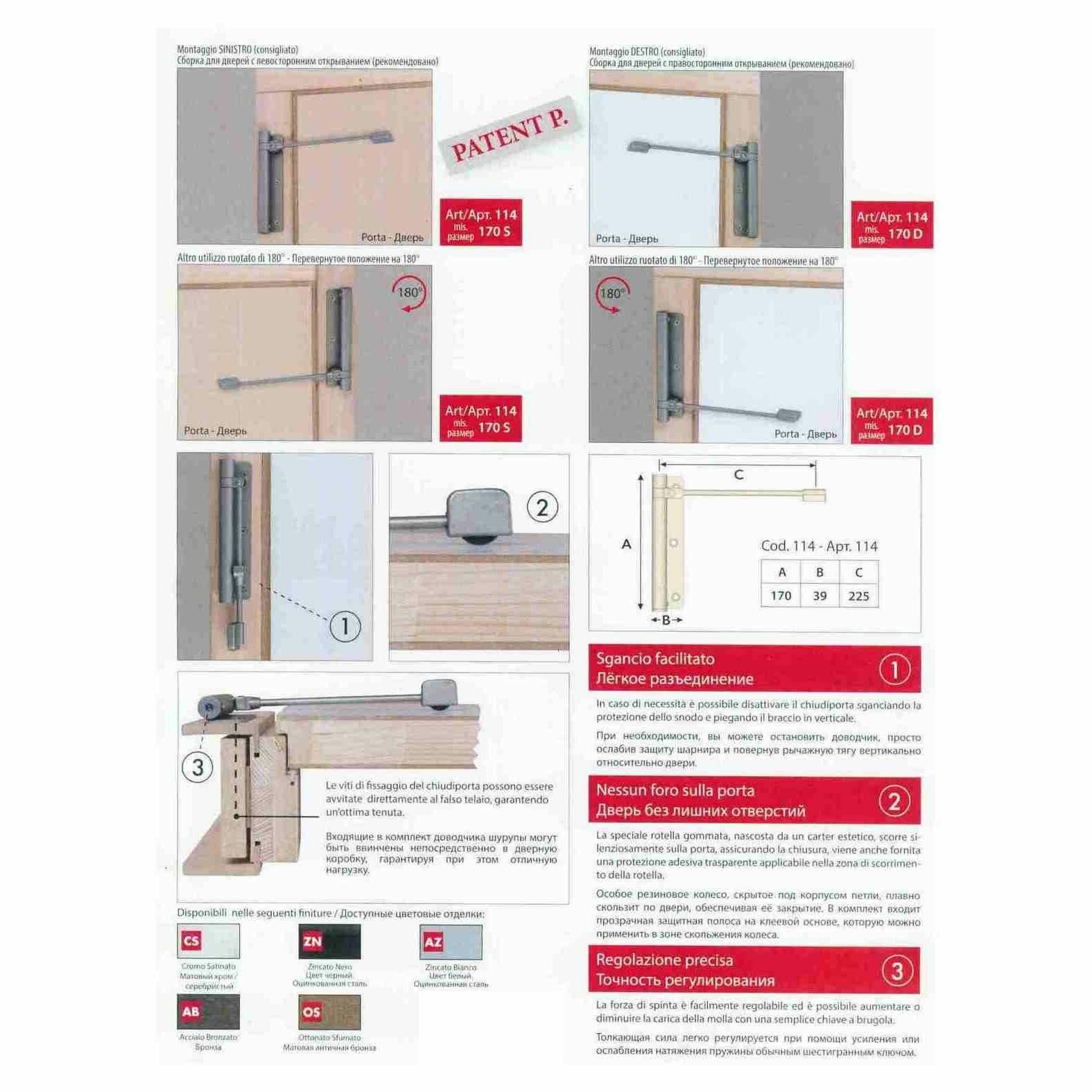Дверной доводчик ALDEGHI LUIGI SPA левый, 170х39х225, цвет: оцинкованная сталь, к-т: 1 шт + ключ с декоративными шурупами 114AZ170S