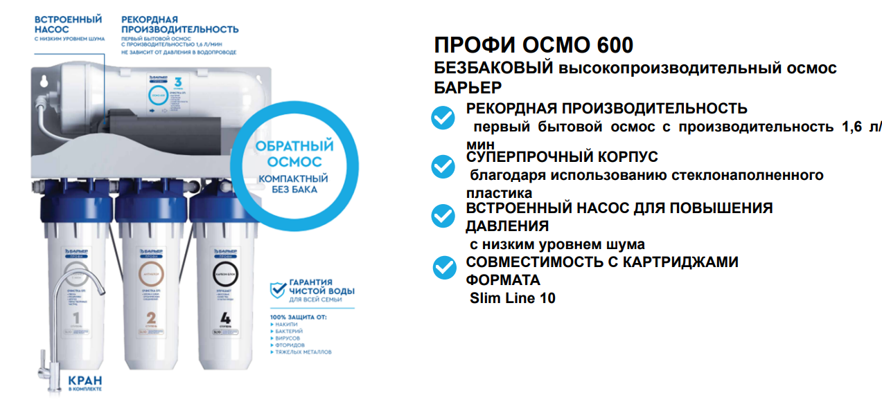 БАРЬЕР профи осмо 600, безбаковый обратноосмотический фильтр, четырехступенчатый (с насосом) информация: