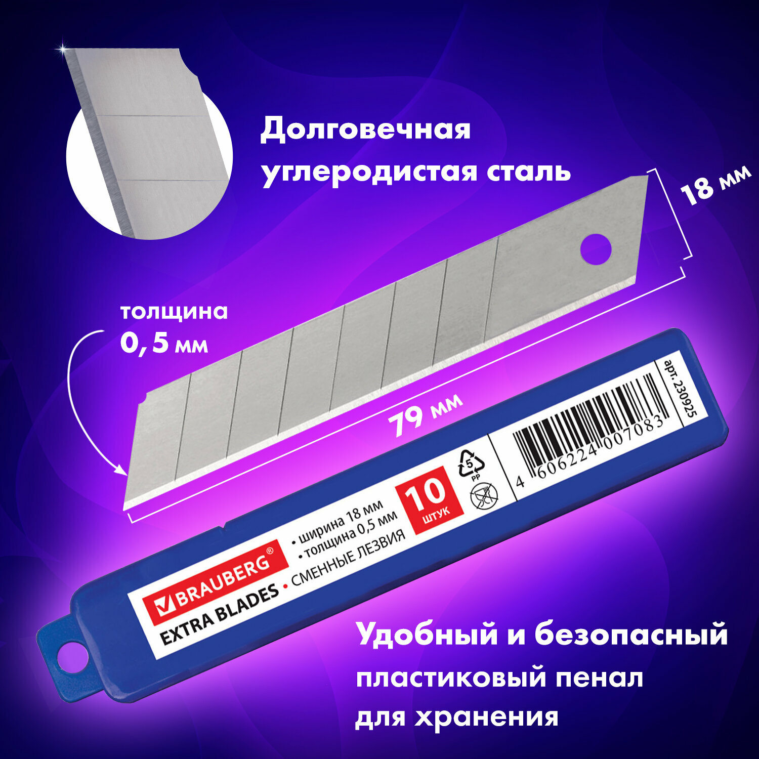 Лезвия-заготовки для канцелярских ножей Brauberg, 18 мм, сегментированные, комплект из 10 шт, толщина 0,5 мм, в пенале, 230925 информация: