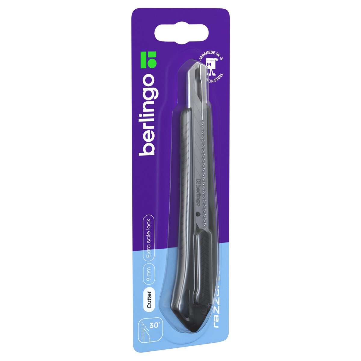 Нож канцелярский 9мм Berlingo "Razzor 400", черное лезвие, auto-lock, металл. направл, европодвес